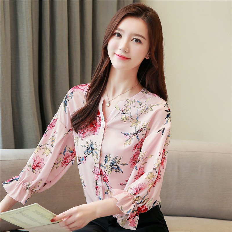 Elegant Floral Printed Long Sleeve V-Neck Casual Tops