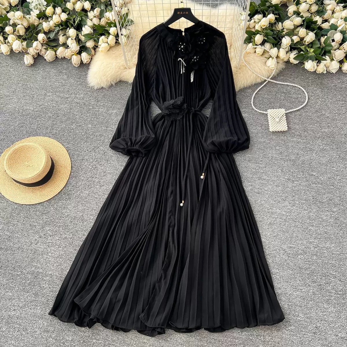 French Style Women Lace Up 3D Flower Femme Robe Loose Pleated Sweet Gentle Dress