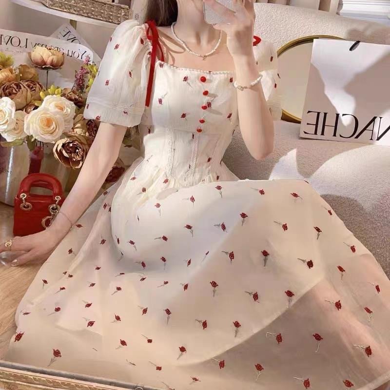 Lace Chiffon Short Puff Sleeve Elegant Dress