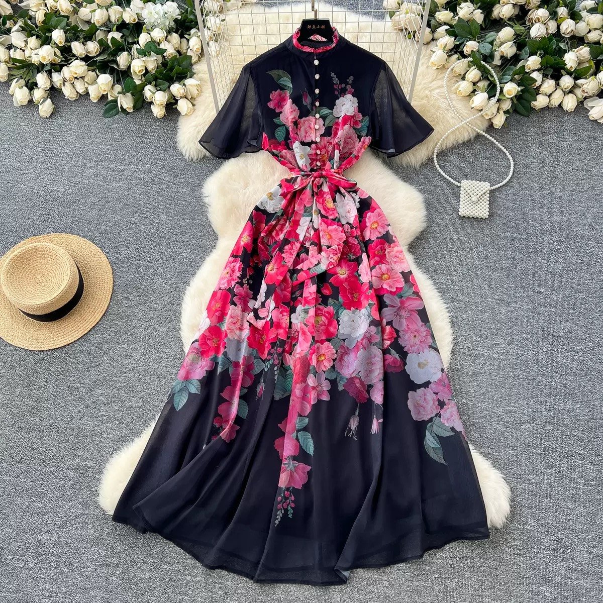 Summer Elegant Flower Floral Chiffon Collar Short Sleeve Slim Vintage French Beach Dress