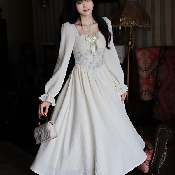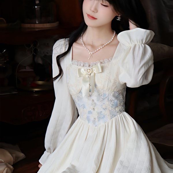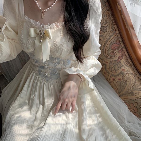Vintage Victorian Style Fairy Dress Woman Summer Jacquard Embroidery Bow Puff Sleeve Sweet Princess Dress