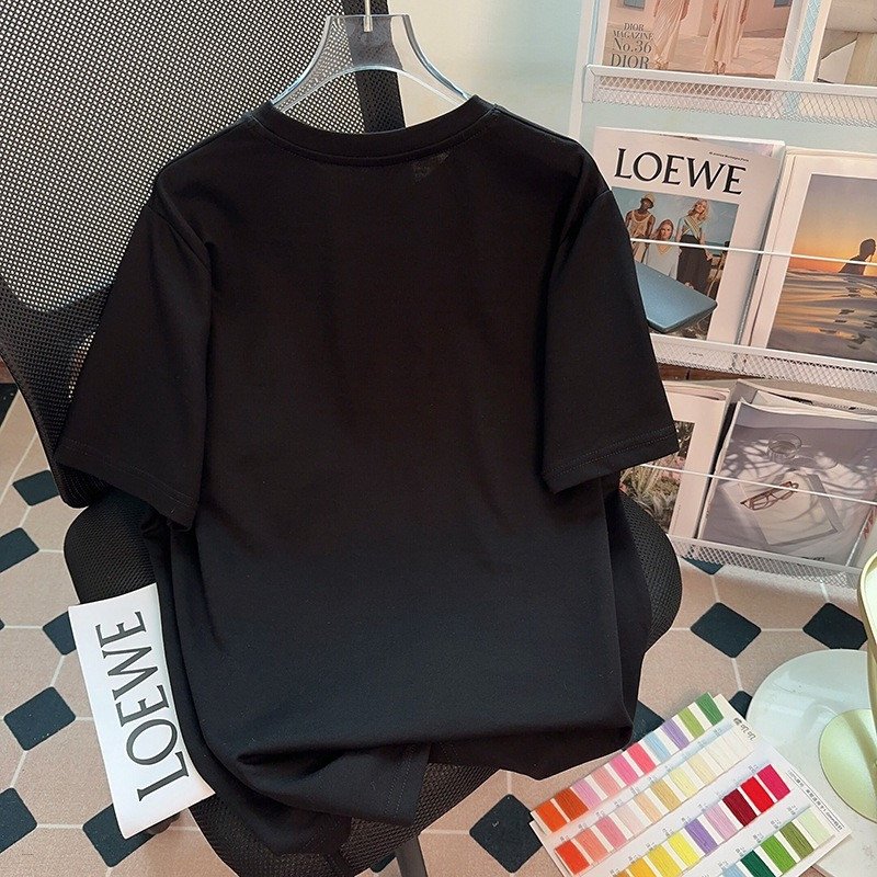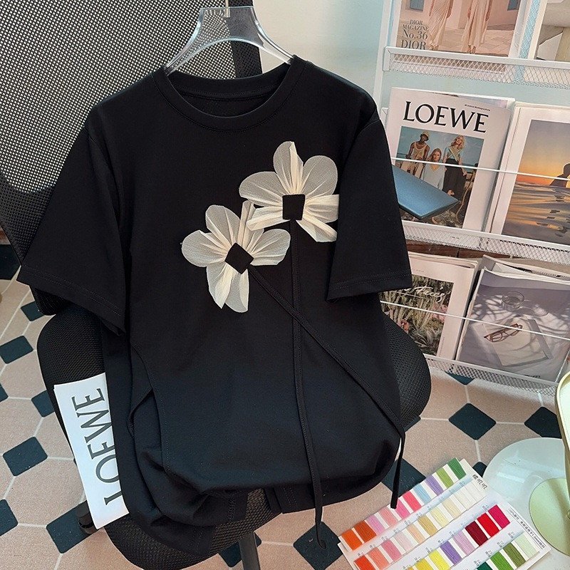 Women Black Flower Ribbon Casual T-shirt Short Sleeve Fashion Tide Spring Summer