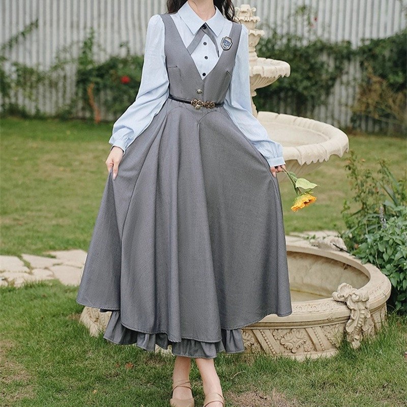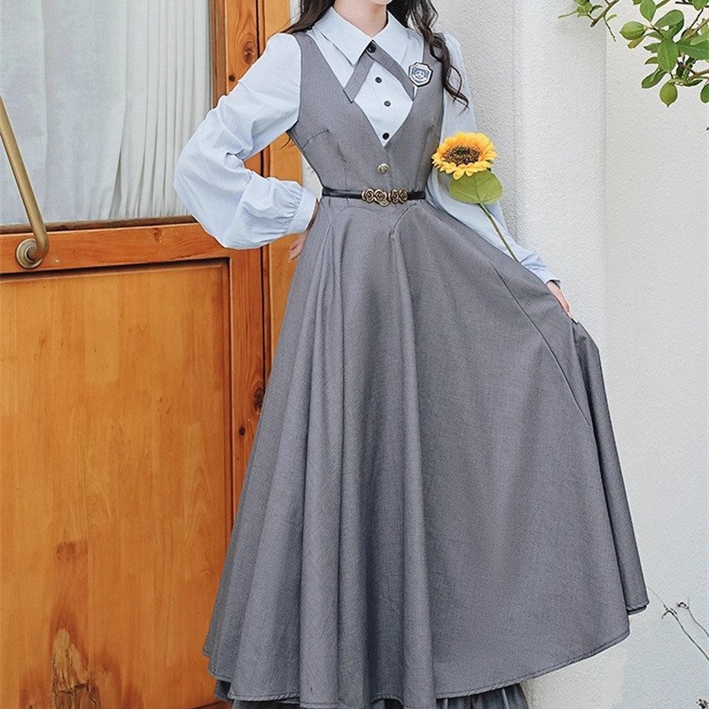 Women High Waist Belted Long Sleeve Lolita Cute Ruffle Long Dress