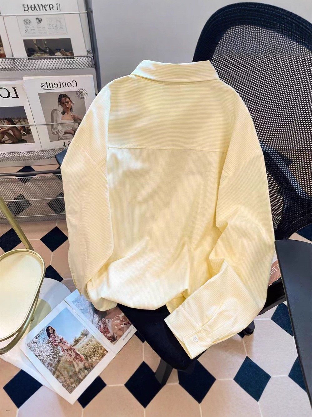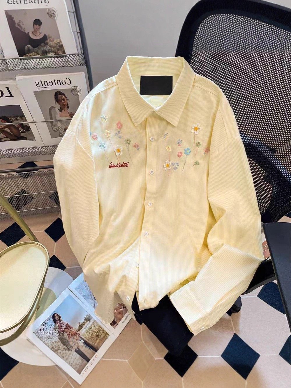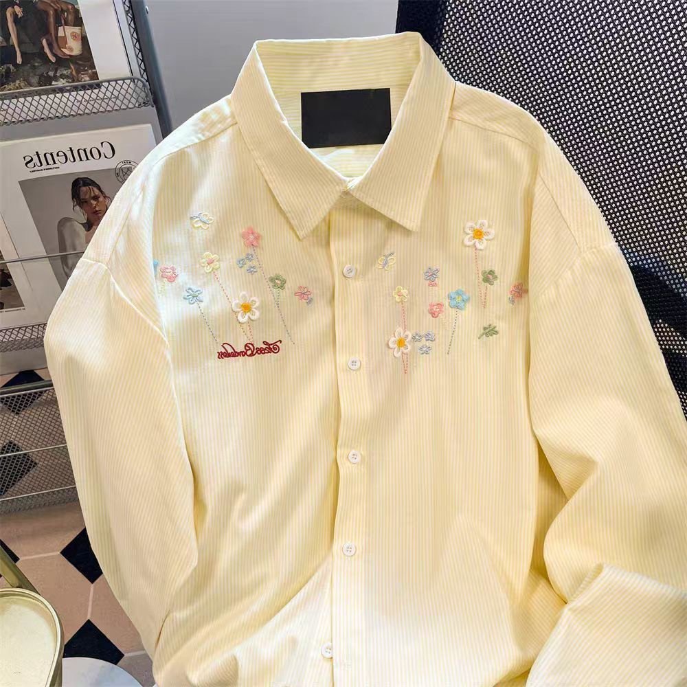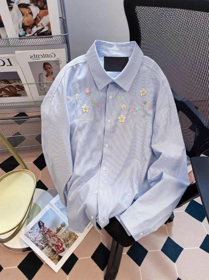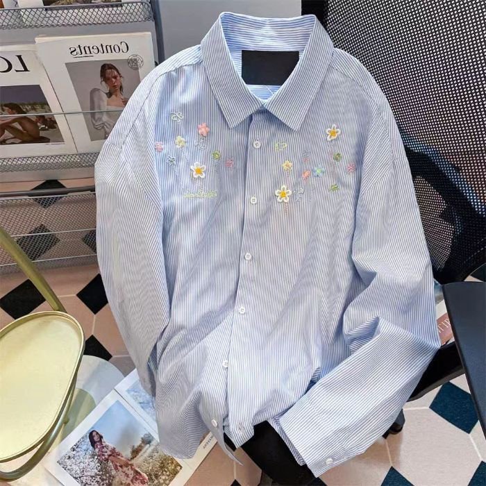 Women Long Sleeve Floral Embroidery Striped Loose Casual Striped Shirts