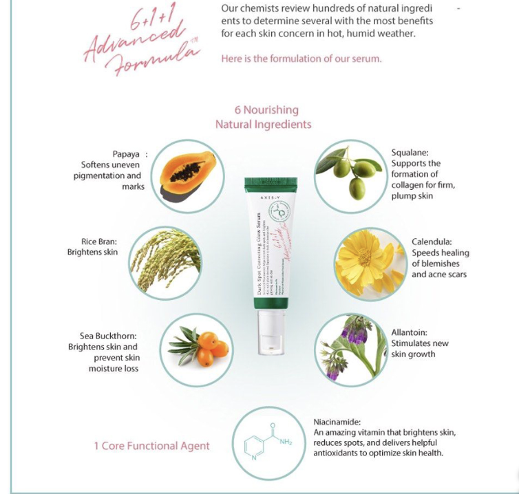 Water, Glycerin, Niacinamide, Sodium Hyaluronate, Propanediol, Erythritol, Butylene Glycol, Squalane, Oryza Sativa (Rice) Bran Extract, Calendula Officinalis Flower Extract, Carica Papaya (Papaya) Fruit Extract, Hippophae Rhamnoides Fruit Extract, Malpighia Glabra (Acerola)Fruit Extract, Polyglyceryl-10 Laurate, Chlorphenesin, Arginine, Ethylhexylglycerin, Carbomer, Glutathione, 1,2-Hexanediol, Hydroxypropyl Cyclodextrin, Disodium EDTA, Hydroxyethylcellulose, Allantoin, Rosmarinus Officinalis (Rosemary) Leaf Oil