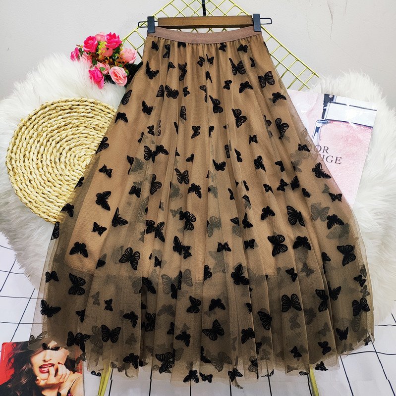 Butterfly Flocking Tulle Midi Mesh Skirt