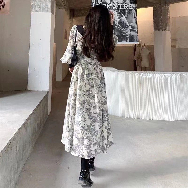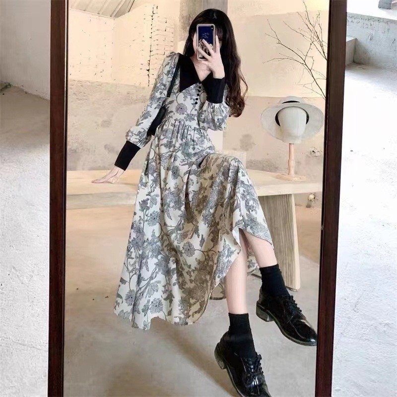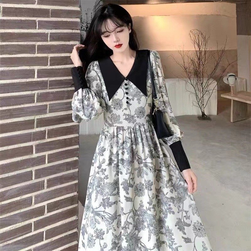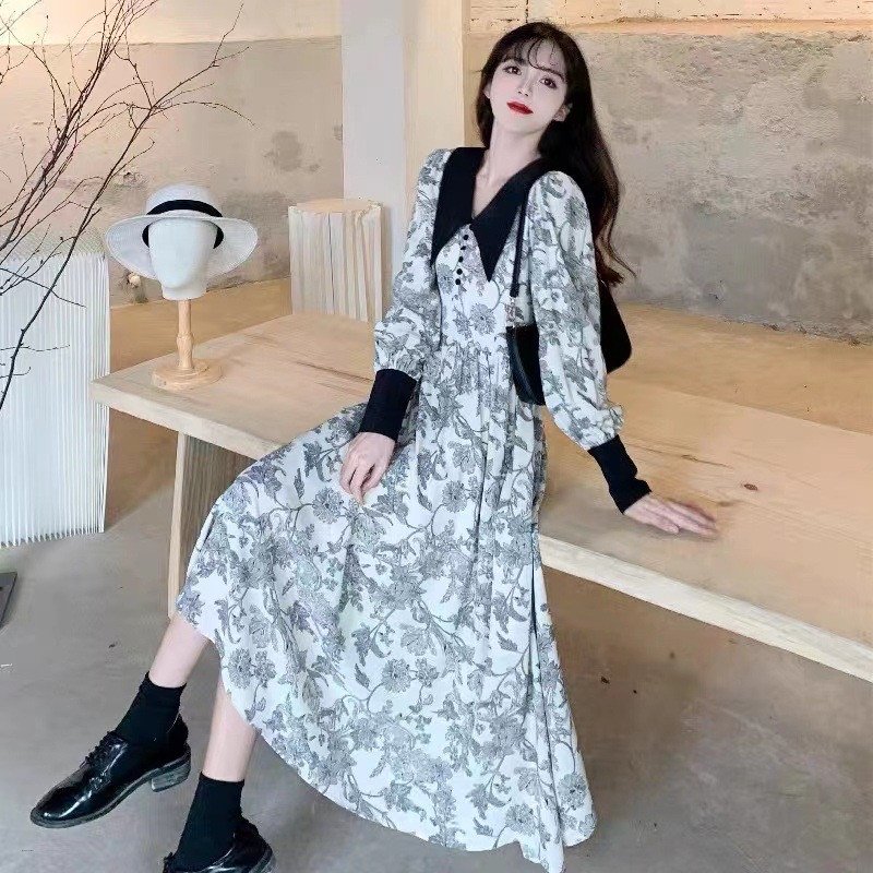 Elegant Fashion Long Collar Floral Design Party Dress