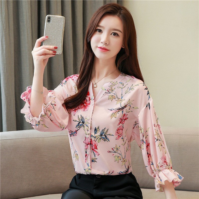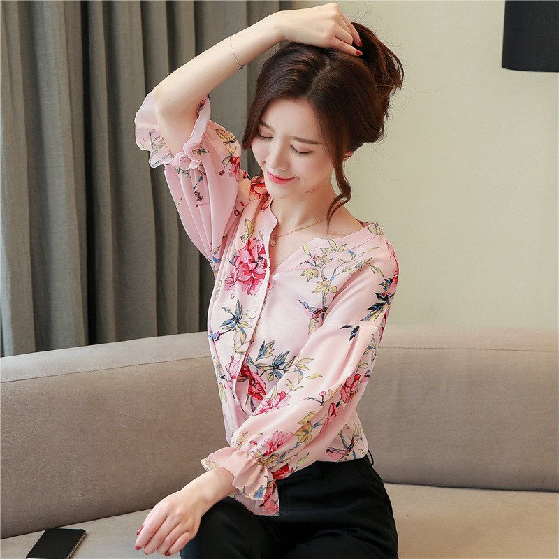 Elegant Floral Printed Long Sleeve V-Neck Casual Tops