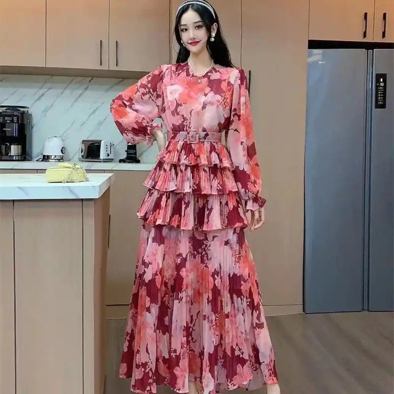 Elegant Flower Printed Long Cake Dress