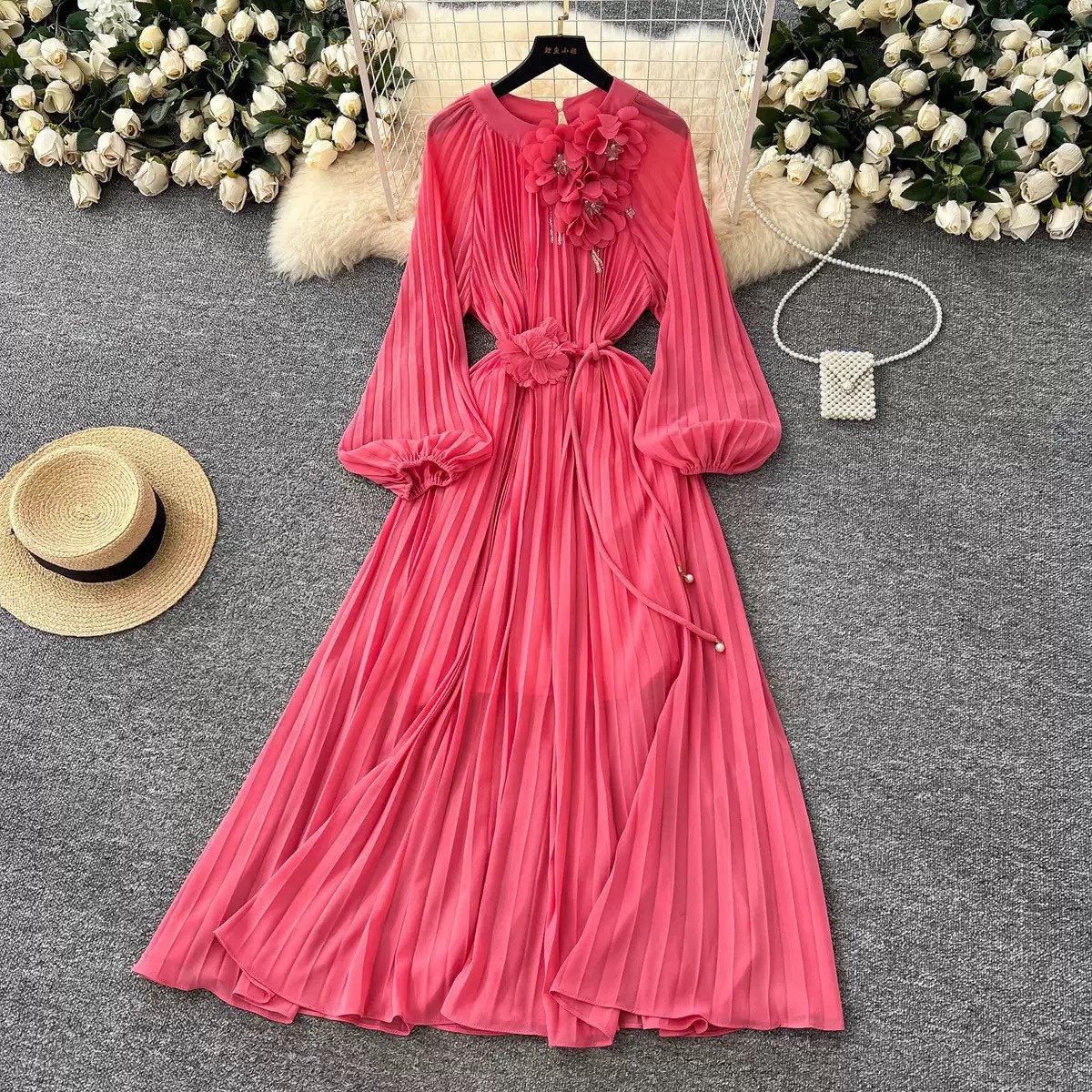 French Style Women Lace Up 3D Flower Femme Robe Loose Pleated Sweet Gentle Dress