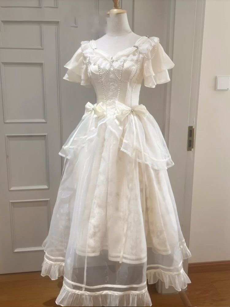 French Summer Court Style Lolita Elegant V-neck Short-Sleeved Waist Thin Lace Edge Dress For Women