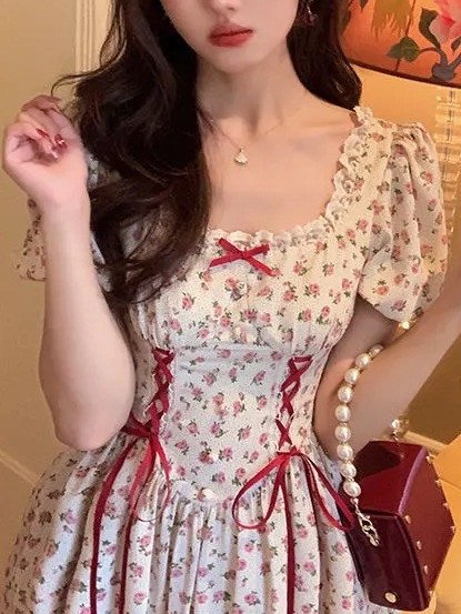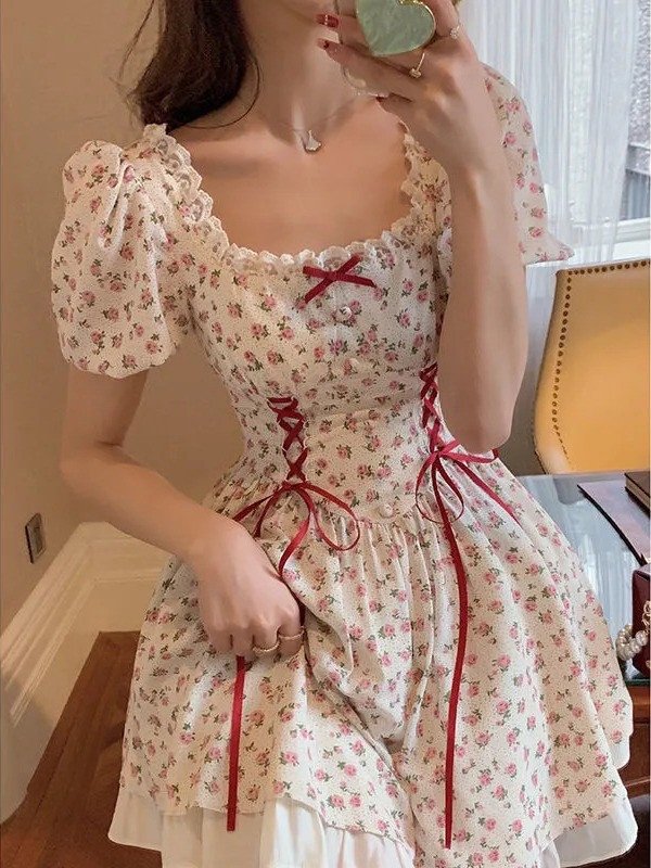 Korean Mini Floral Ribbon Decoration A-Line Summer Dress
