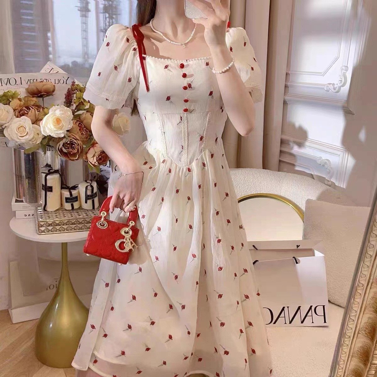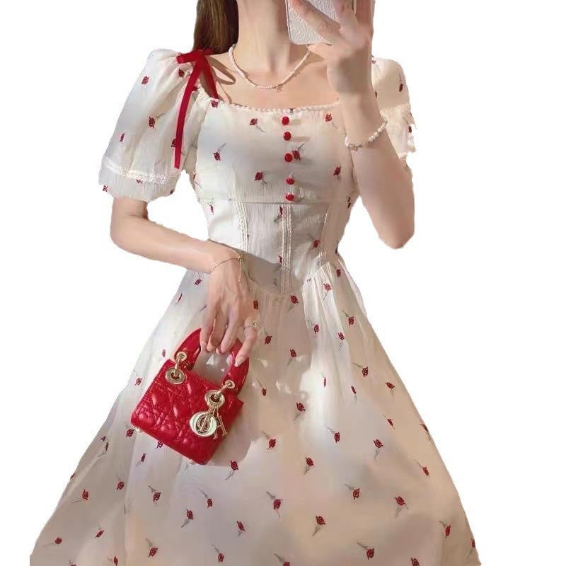 Lace Chiffon Short Puff Sleeve Elegant Dress