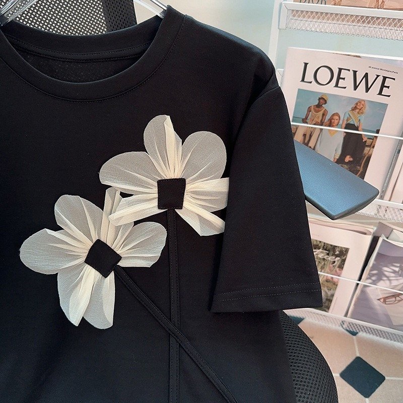 Women Black Flower Ribbon Casual T-shirt Short Sleeve Fashion Tide Spring Summer