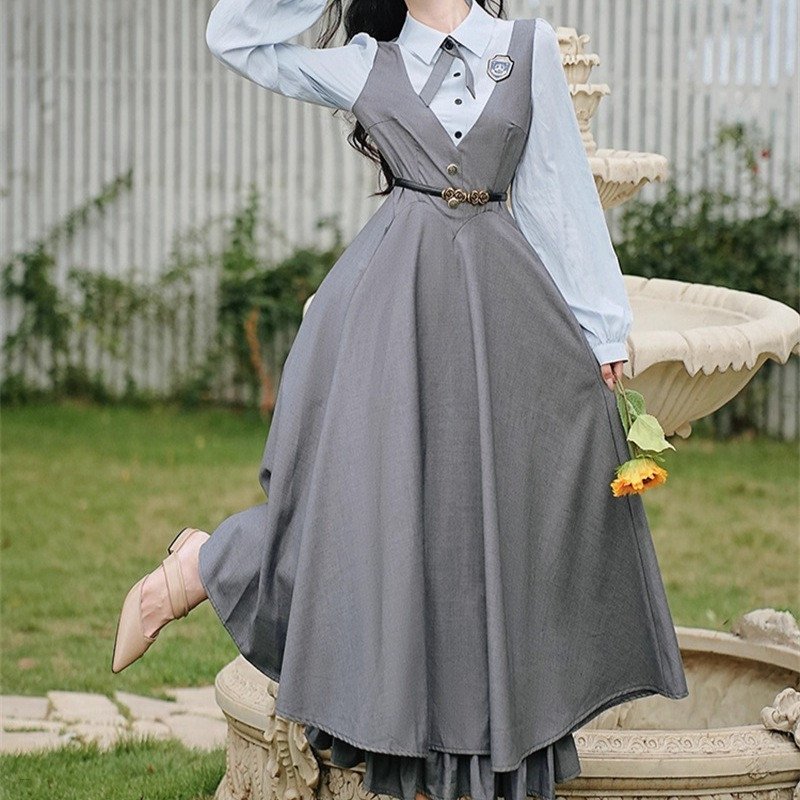 Women High Waist Belted Long Sleeve Lolita Cute Ruffle Long Dress