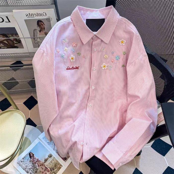 Women Long Sleeve Floral Embroidery Striped Loose Casual Striped Shirts